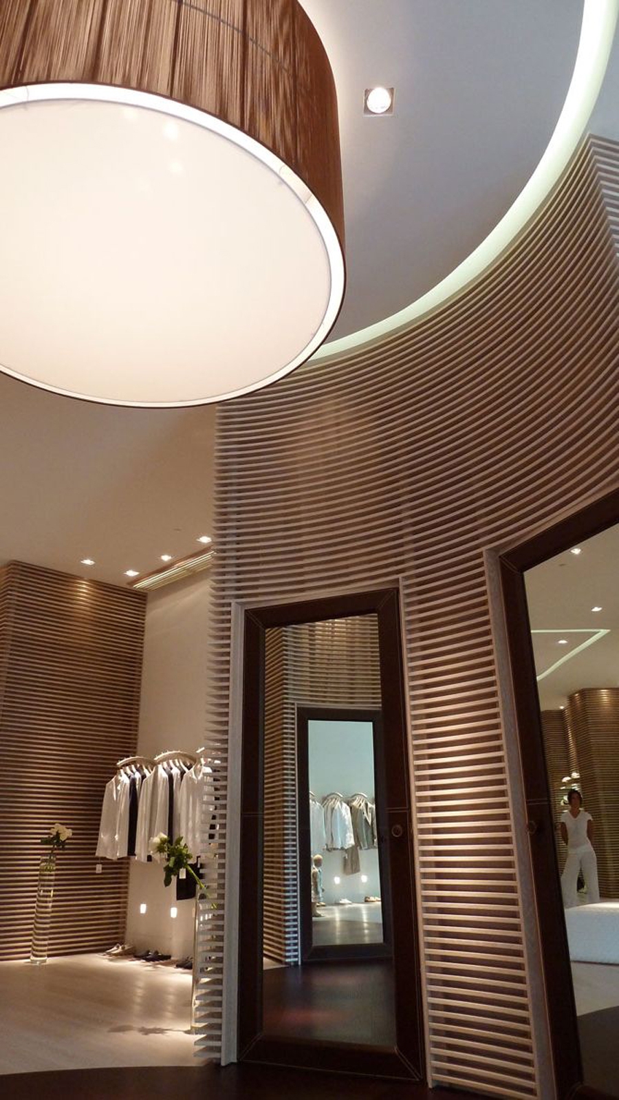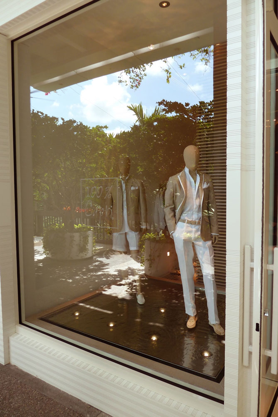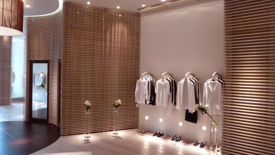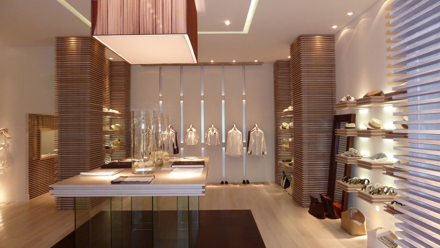 Il design si ispira alla trasparenza e alla leggerezza del lino, il materiale protagonista del brand. I pannelli in legno, stile boiserie coloniale, rivestono le pareti creando spazi aperti e luminosi. I colori dominanti come avorio e sabbia si combinano insieme a materiali naturali come la pelle e il legno, suscitando un’illusione di una vacanza a Capri.