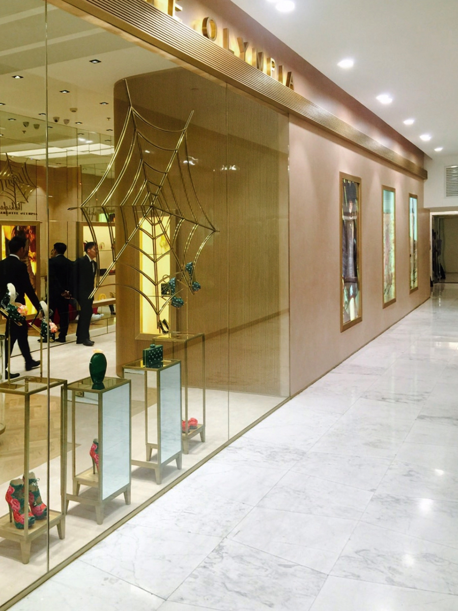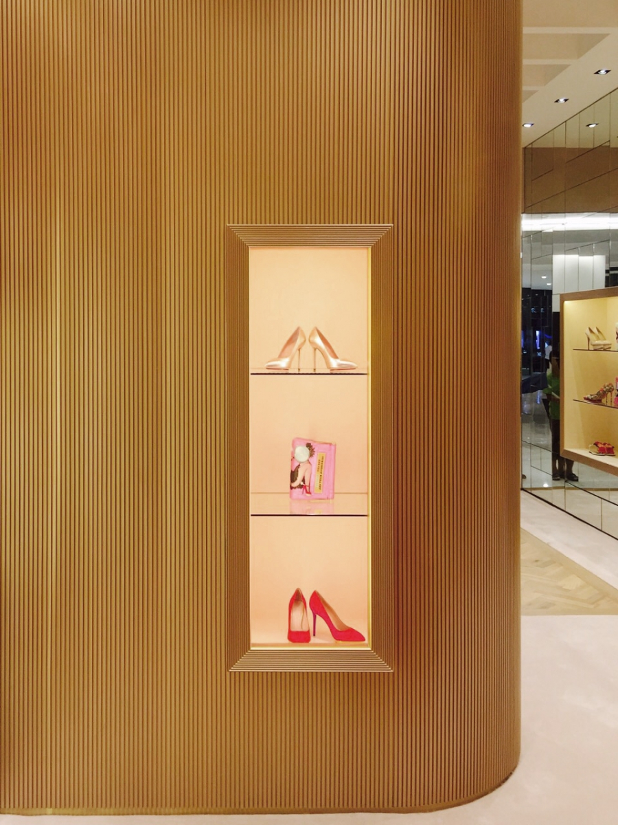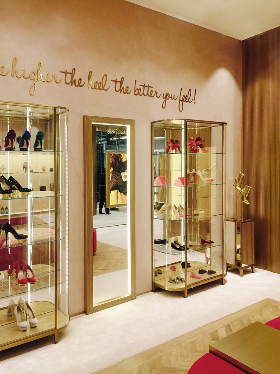 La boutique riflette lo stile glamour hollywoodiano. Linee curve sugli arredi, la predominanza di colori cipria e materiali come l’ottone e lo specchio creano una scena che è un mix tra lusso e sofisticatezza.