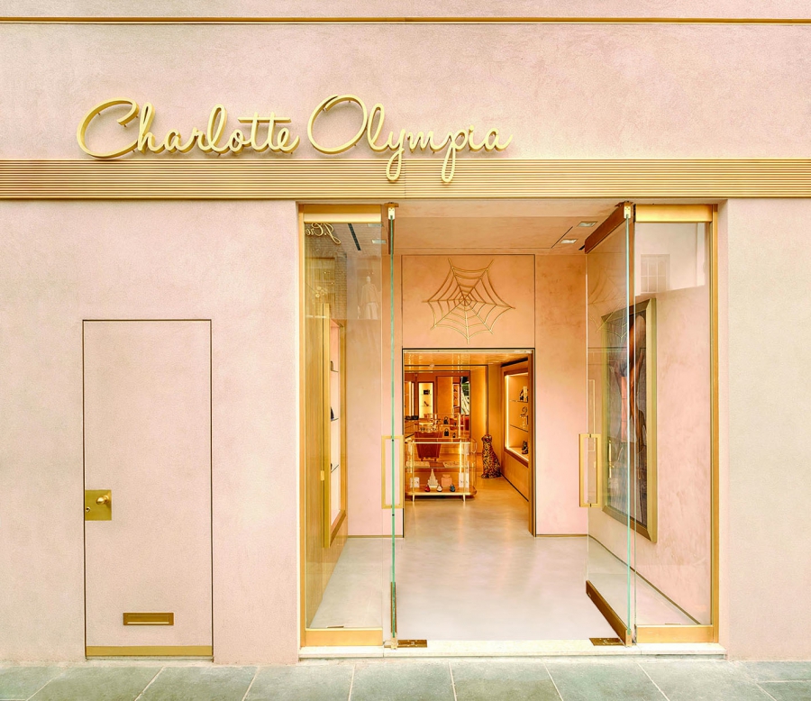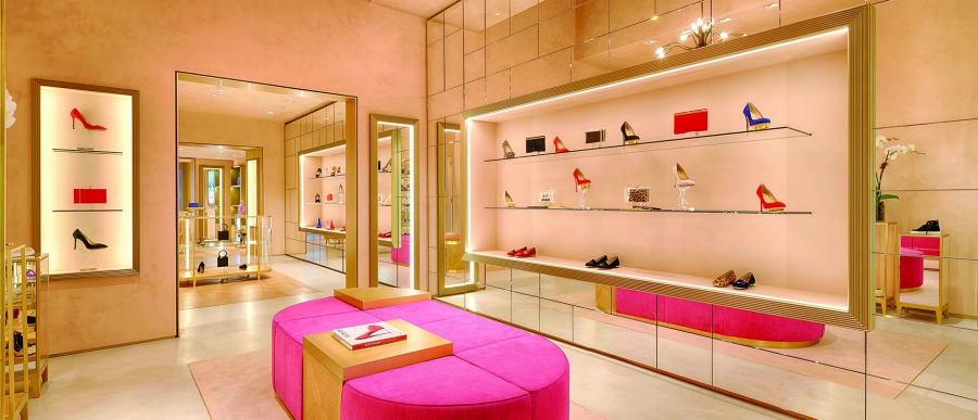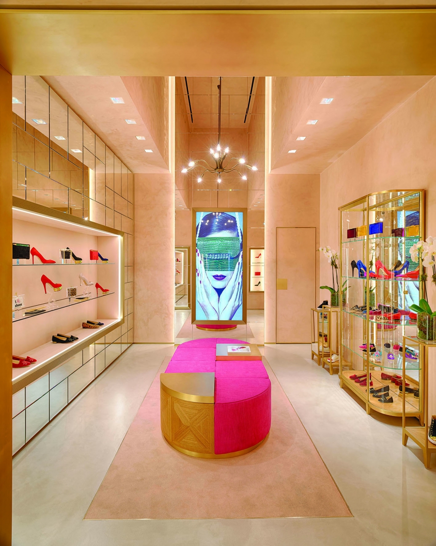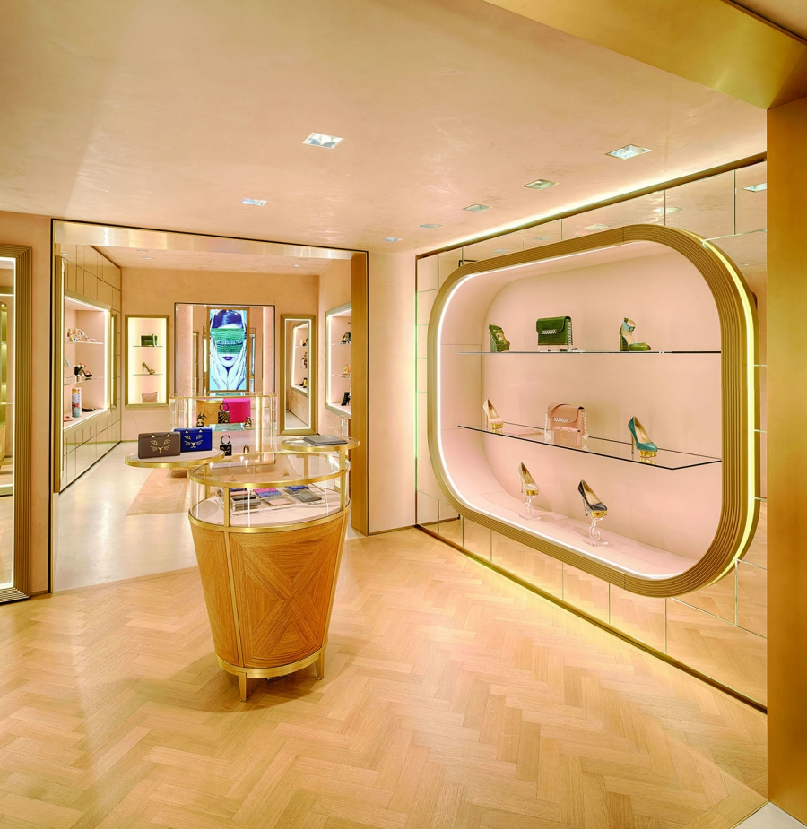 La boutique riflette lo stile glamour hollywoodiano. Linee curve sugli arredi, la predominanza di colori cipria e materiali come l’ottone e lo specchio creano una scena che è un mix tra lusso e sofisticatezza.