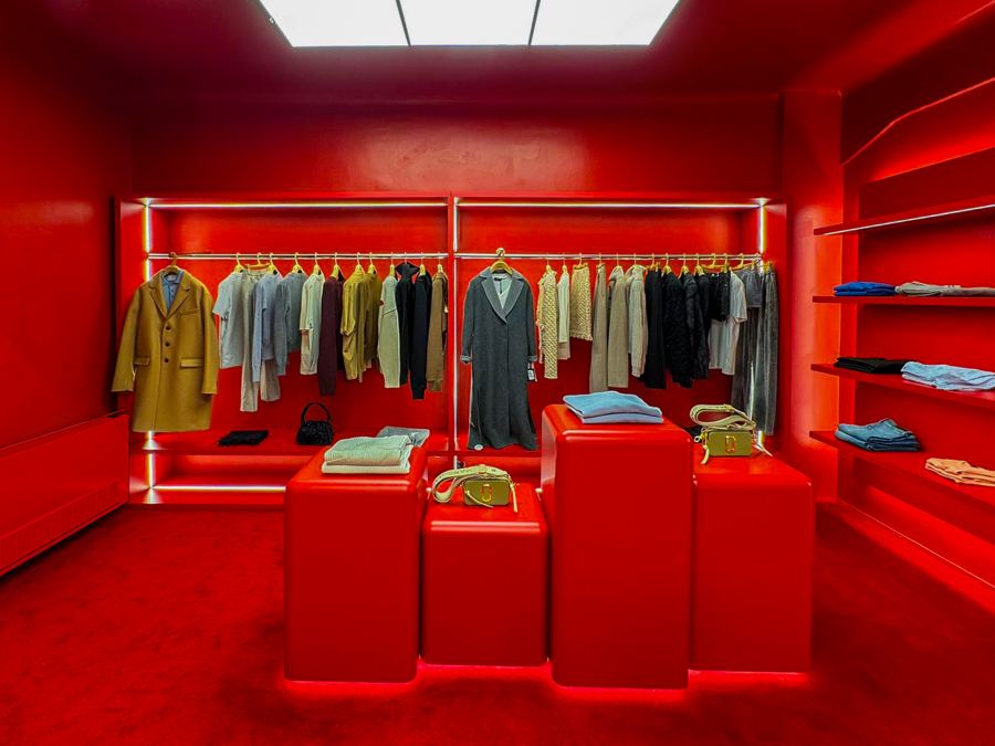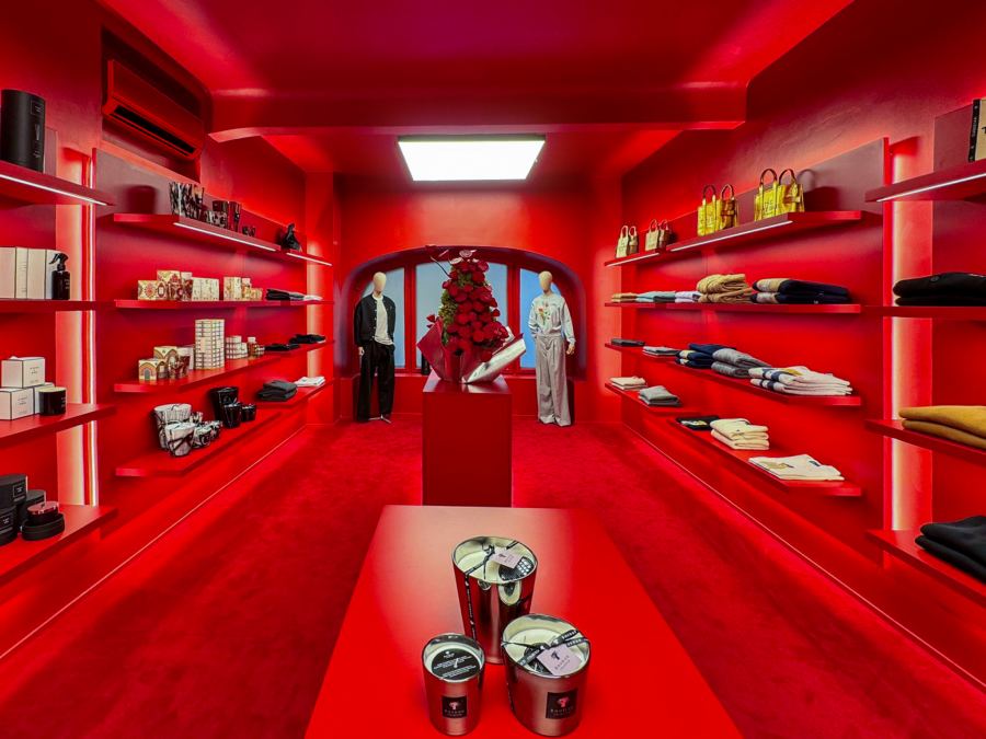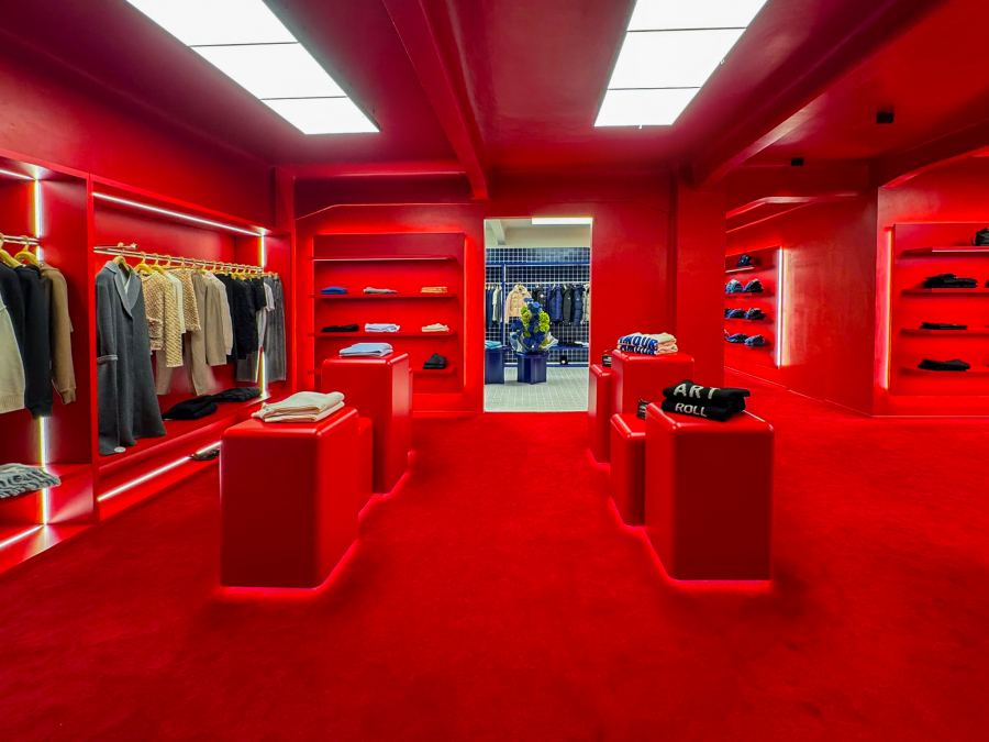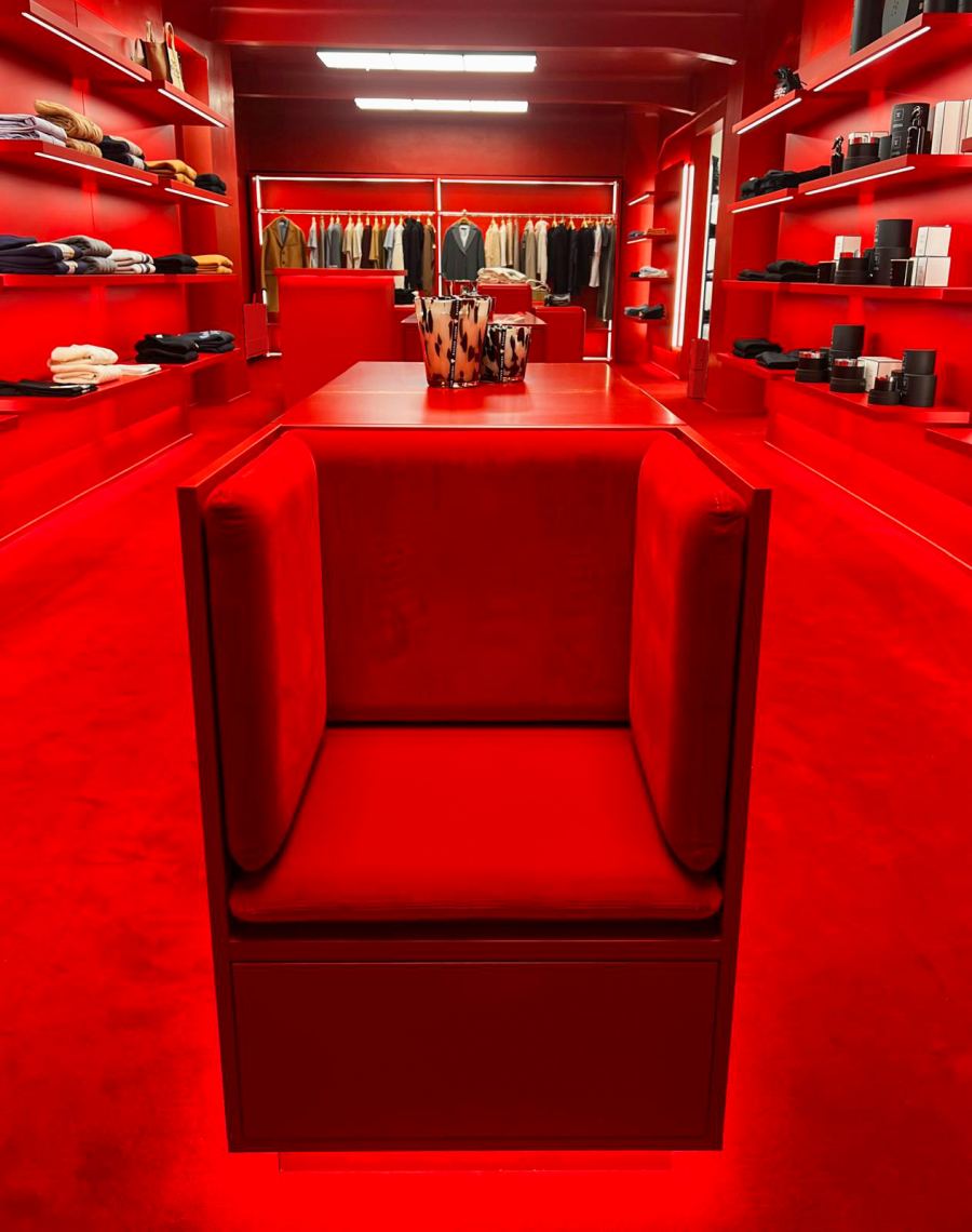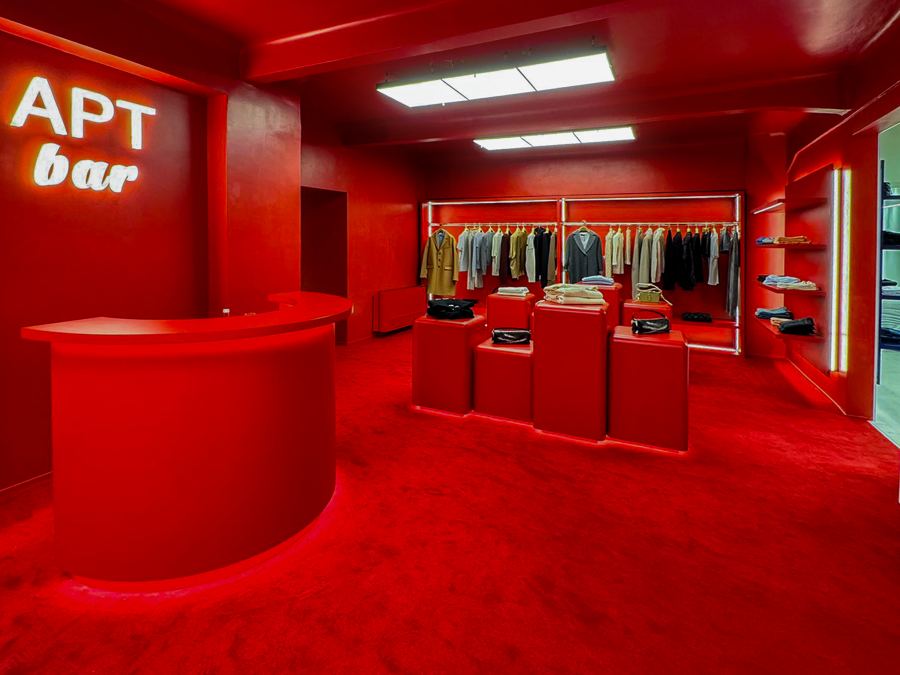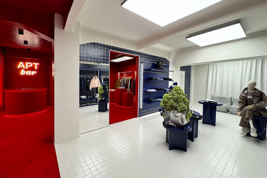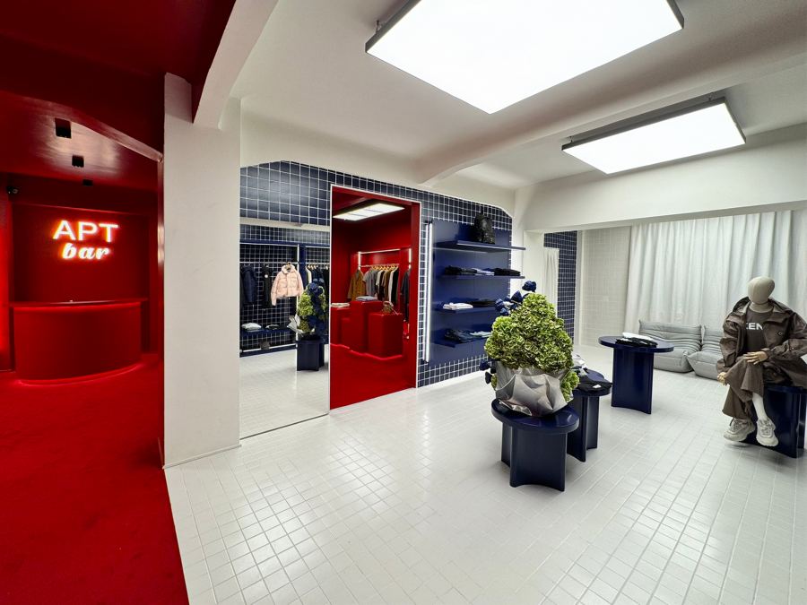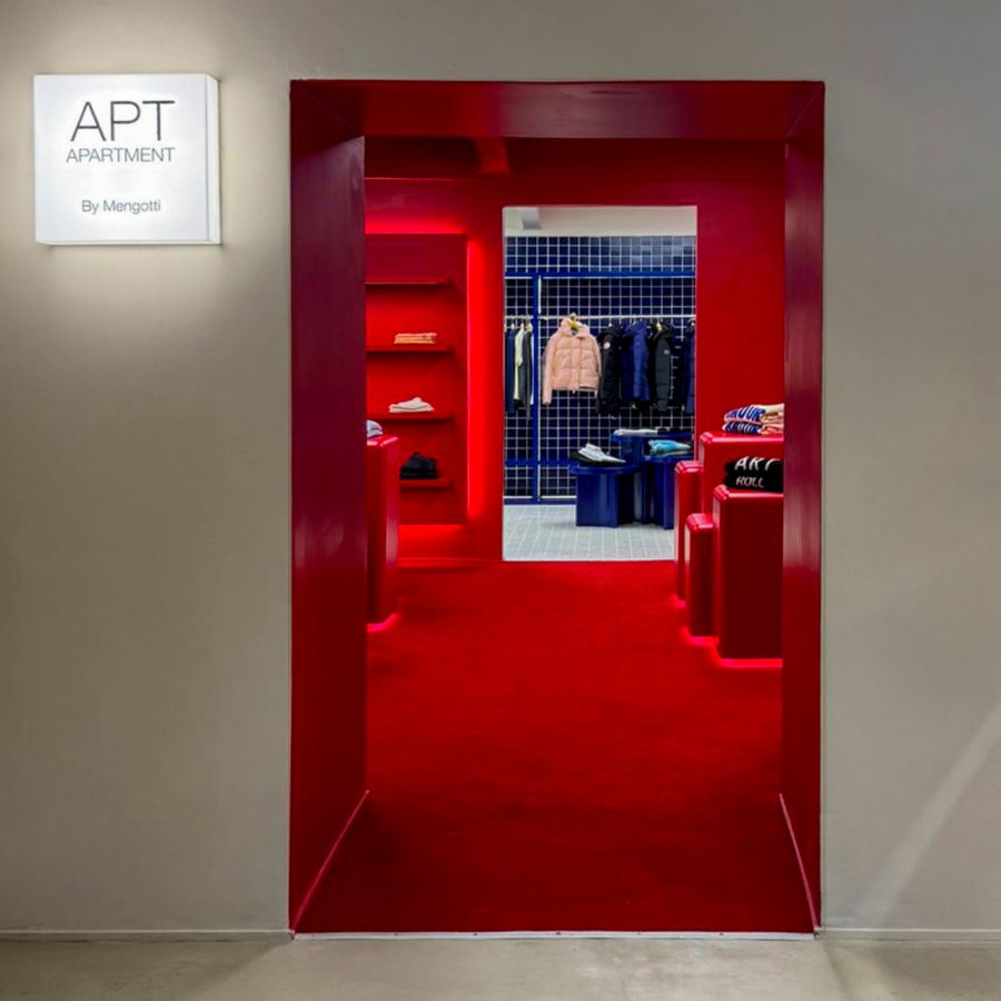 Located within the Mengotti flagship, APT - Apartment by Mengotti is a new concept space dedicated to younger and more dynamic brands. Designed by Giachi Studio, it features bold red volumes, deep blue tiles, and bright white surfaces that create a vibrant and contemporary atmosphere. The presence of the APT Bar adds a social and lifestyle dimension, turning the store into an immersive and modern shopping experience.