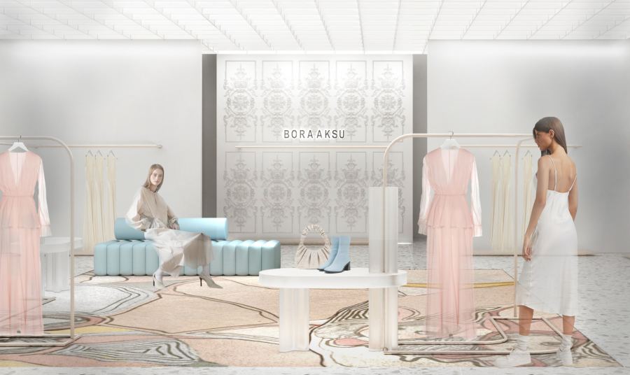 The keywords of fashion brand BORA AKSU: romantic and femininity. In the new store in Wuhan we were trying to represent the turkish designer signature style, with its grace, romantism and contrasting elements. In the new space we used pastel soft colors, which create a sence of femininity. And at the same time the integration of elements with complex shapes gives the feeling of independence and contemporary. For the covering main area of the store was used the carpet with an individual design from BORA AKSU. Fabulous sketches and patterns take the imagination into the magical world of author.