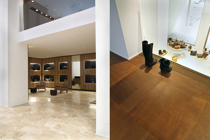 The Tuscan family-owned brand Buttero chose Corso Garibaldi for its first location in Milan. The store, open and visible from the street, is designed to communicate the company’s expertise in handcrafted shoes and their timeless leather designs. Divided into 2 storeys, the ground floor caters to the customers with a combination of tradition and modernity – hence the cash desk area was created with an old working counter and a mirrored surface tech-style desk. The wood cladding niche system places each shoe in the collection into its own display niche. The upper storey, reached by an industrial spiral staircase, welcomes the customer with a special flooring of different pieces of leathers chosen from the company’s vast selection. The result is a fusion of rawness and elegance which recalls the true essence of the brand Buttero.
