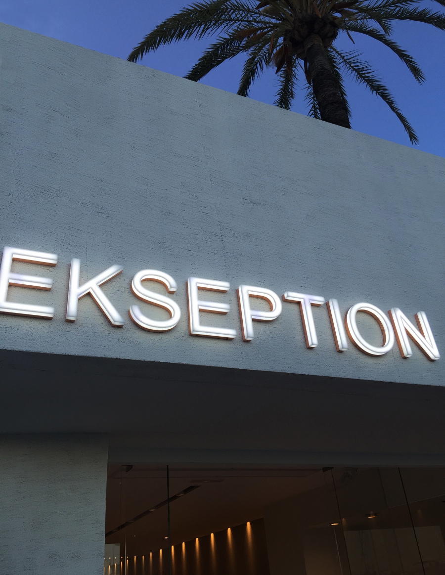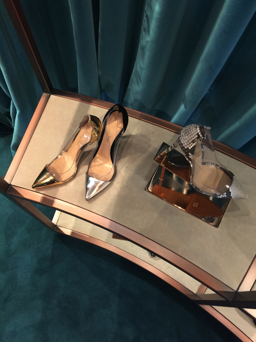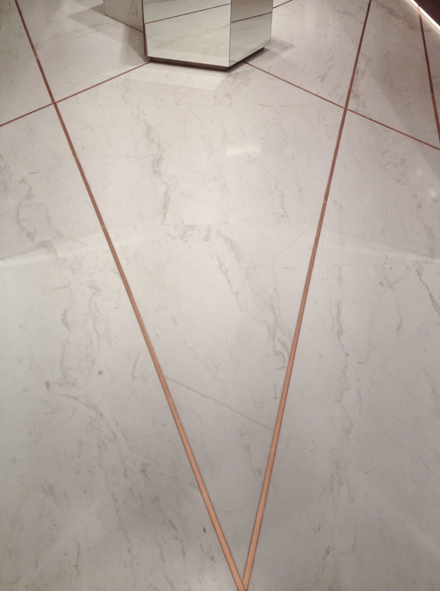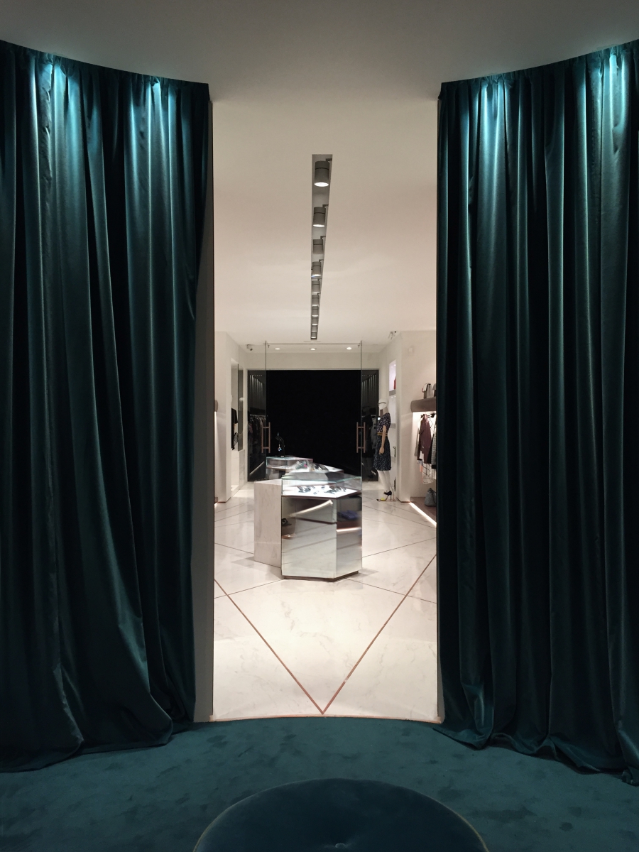 A high-end multi-brand store positioned on the waterfront of Puerto Banus, Spain. The sales area stands out with its beautiful Carrara marble floor with copper inserts and the linear copper displays that lead to a circular room dedicated to shoes. The space dedicated to shoes has walls covered in soft blue velvet that recalls the color of the sea outside the window.