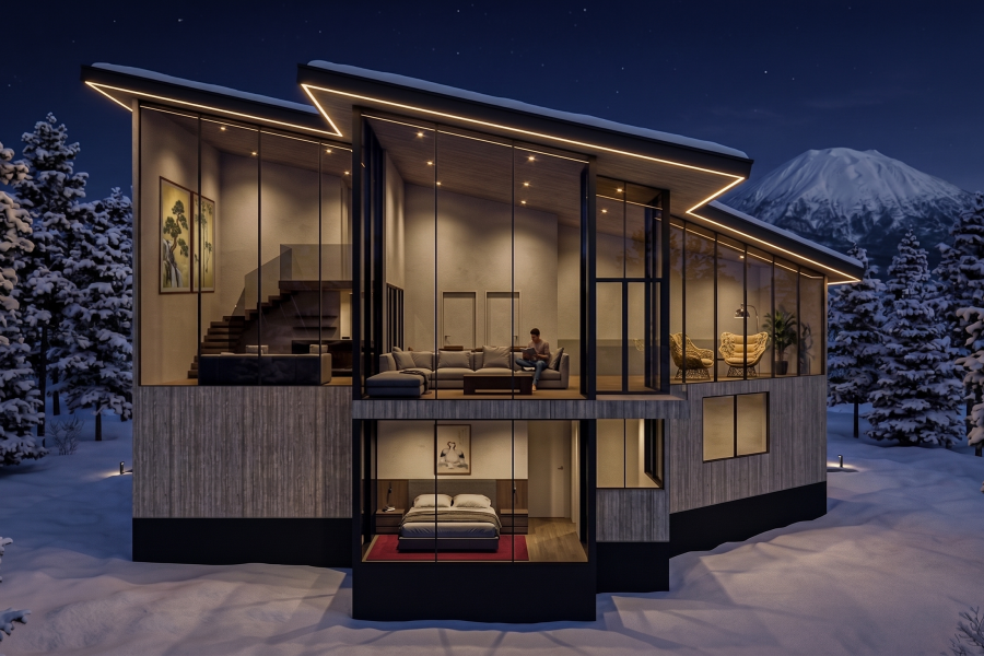 Giachi Studio designed this concept private chalet in Niseko as a contemporary alpine retreat defined by transparency and light. Expansive floor-to-ceiling glazing wraps the living spaces, dissolving the boundary between interior and the snowy landscape while maximizing views and natural light. Organized across multiple levels, the design places private bedrooms below and an open living, dining, and kitchen space above, with a mezzanine offering a quiet retreat. Warm timber finishes balance the sleek glass façade, creating a calm and inviting mountain sanctuary.