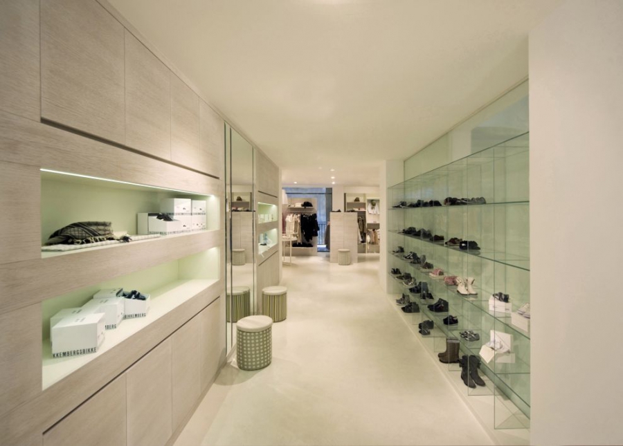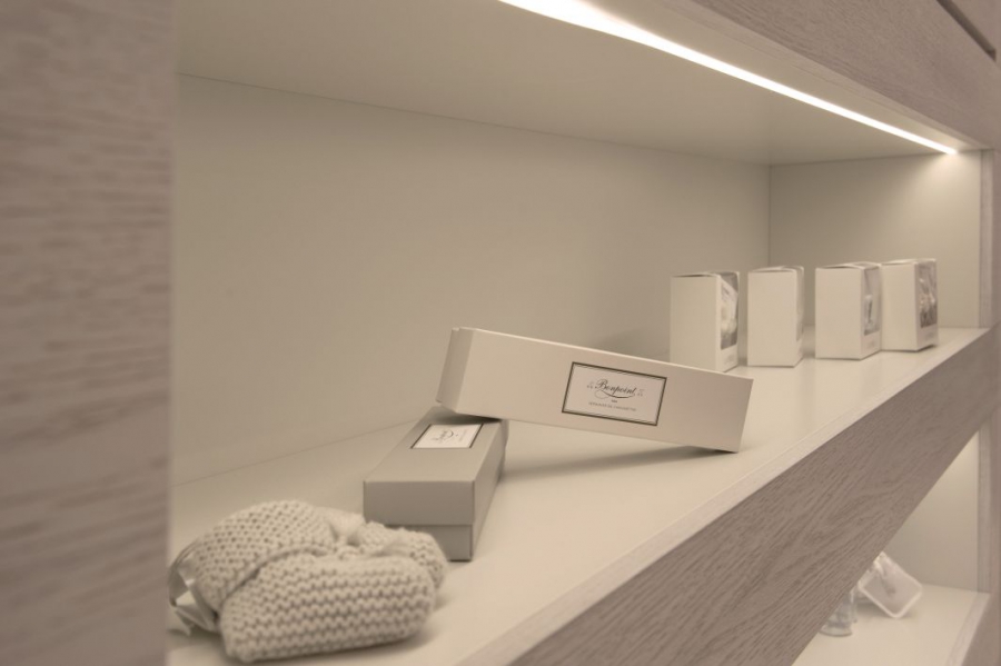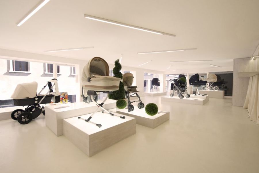 The renovation of the existing historical multi-brand childrenswear store in the heart of Treviso, Italy. All perimeters of the store have an adjustable paneling system which answer to the needs of the display whilst in the middle of the space there are freestanding units covered in children’s fabric. The dominant colour used was beige in order to highlight the fashionable childrenswear products. The shelving units used to showcase the shoes is completely made of transparent glass. The upper floor is dedicated to the stroller displays with self-illuminated platforms and an organic touch of green plants.